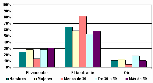 Aún siendo desde ahora el vendedor responsable de la garantía del producto, un 60 por ciento de los entrevistados considera que es el fabricante quien debe responder al final de la calidad del bien ante el consumidor. No obstante, dicha respuesta no excluye la gestión inmediata de sustitución o reparación por parte del vendedor, quien, en todo caso, es el experto que debe seleccionar los productos y relacionarse con los fabricantes. En este sentido, un 80 por ciento de los consultados contempla con beneplácito que el vendedor se haga directamente responsable de la calidad del producto.