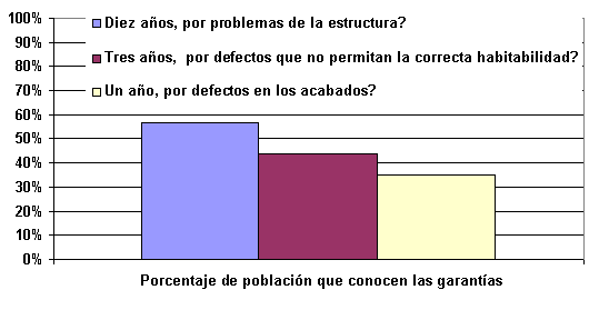 Los distintos periodos de garantía del edificio son conocidos por porcentajes de la población que oscilan desde el 57 por ciento, que sabe que la garantía por problemas de estructura dura 10 años, hasta un 35 por ciento, conocedor del periodo de un año que tienen para reclamar defectos en los acabados.