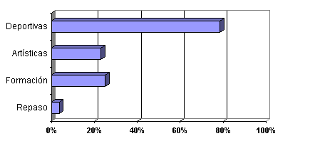 El 77% de los estudiantes realiza actividades extraescolares: De éstos, un 78 por ciento deportivas y un 28 por ciento artísticas. Un 80% de los centros están equipados con instalaciones deportivas, biblioteca, aula informática y comedor.