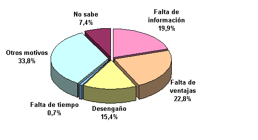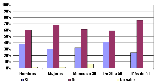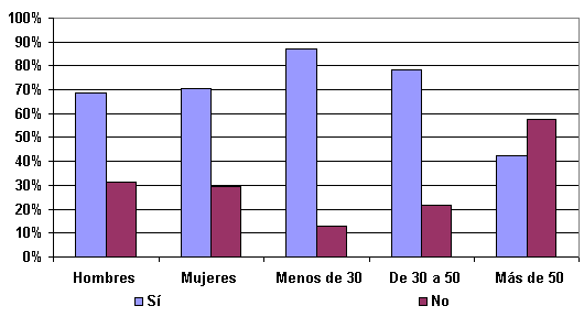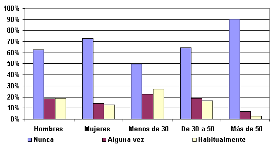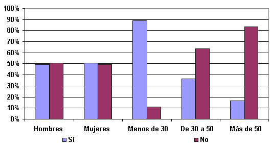 Un 30 por ciento de los españoles ya es usuario de Internet. Esta proporción también varía mucho según la edad: En los menores de 30, una de cada dos personas ha accedido a Internet, mientras que los mayores de 50 lo han hecho una de cada diez personas. No obstante, el navegar por la red ha dejado de ser privilegio o simple hábito de la juventud. Todos los grupos de edad avanzan en la red, incluso los más mayores.