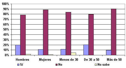 Cerca de un 15 por ciento de los entrevistados afirma haber tenido algún problema con su compañía habitual. Se observan variaciones de respuestas entre grupos de sexo y edad que pueden ser debidas a un distinto nivel de conocimiento sobre el servicio.