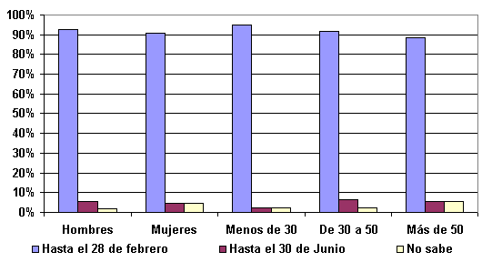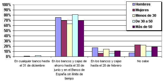 La gran mayoría (91%) conoce perfectamente el 28 de febrero como fecha límite para efectuar compras con pesetas y el 70 por ciento sabe que hasta el 30 de junio podrá cambiar pesetas por euros en cualquier caja de ahorros o banco y sin límite de tiempo en el banco de España.