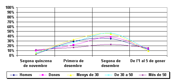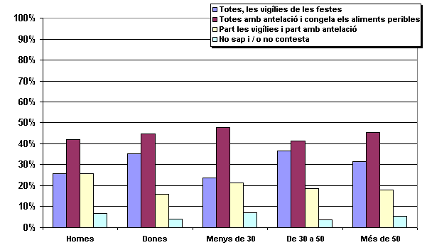 En relació amb l’enquesta efectuada l’any passat, s'observa un lleuger augment del percentatge de les persones que afirma la seva intenció de realitzar amb major antelació les compres de Nadal. Hi ha una bona disposició a congelar els productes alimentaris i aconseguir d'aquesta forma preus més racionals, així com evitar les aglomeracions i les presses d’última hora.