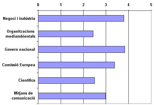 Pregunta 04.- Hi ha diferents fonts dinformació que fan referència a assumptes mediambientals. En una escala de l1 al 5 on 1es "tinc molta confiança" i 5 "no confio gens", Quina és la seva confiança respecte...?