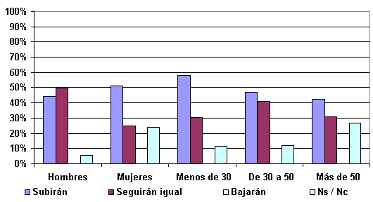 Más de la mitad de la población que se pronuncia, opina que el euro provocará subidas generalizadas en los precios. En este sentido, las mujeres y los más jóvenes se muestran mucho más convencidos de que la falta de hábito del euro esconderá un aumento injustificado en el coste de la vida. Los que opinan que los precios aumentarán, se muestran, naturalmente preocupados por esta circunstancia.