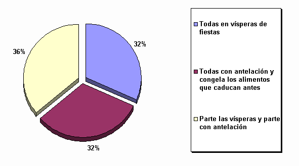 Todo el mundo considera ventajoso avanzarse en las compras de los productos alimentarios para ahorrar y para evitar las aglomeraciones. Pero, la necesidad de esperar la paga y la falta de disposición económica hace que los hábitos de compra sean muy dispersos. En una proporción prácticamente idéntica, hay quien compra en vísperas de fiestas y hay quien congela los alimentos con cierta antelación.