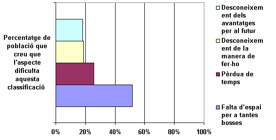 Cal destacar que en moltes poblacions catalanes el principal motiu pel qual la gent no classifica les deixalles és perquè no hi ha contenidors específics, o bé perquè en molts casos els hi queda lluny.
