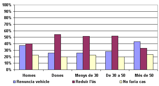 Renunciar a l’ús del propi vehicle en cas de problemes greus de contaminació no s’accepta totalment; malgrat això, la reducció de l’ús del cotxe o de la moto és una alternativa molt més acceptada, tot i sent el cotxe el principal instrument contaminant, en opinió dels entrevistats, més que les fàbriques o el conjunt urbà.