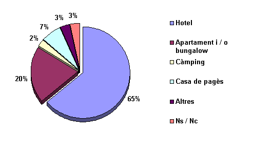 En quant a l' allotjament, la població de Catalunya continua tenint preferència pels hotels. Després pels apartaments i la resta d' opcions com són càmpings, cases de pagès, etc. en una proporció bastant més baixa.