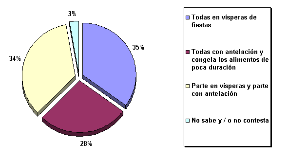 En cuanto a las fechas en que se acostumbra a hacer las compras, cabe destacar que las respuestas han sido bastante dispersas. En una proporción similar, hay quienes compran en vísperas de fiestas y hay quien congela los alimentos con cierta antelación. Si bien se reconocen las ventajas de evitar aglomeraciones y reducir el gasto.
